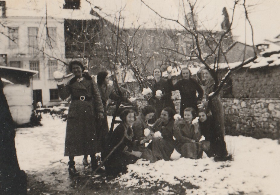 Η αδερφή τού πατέρα μου και οι φίλες της χαίρονται το χιόνι.