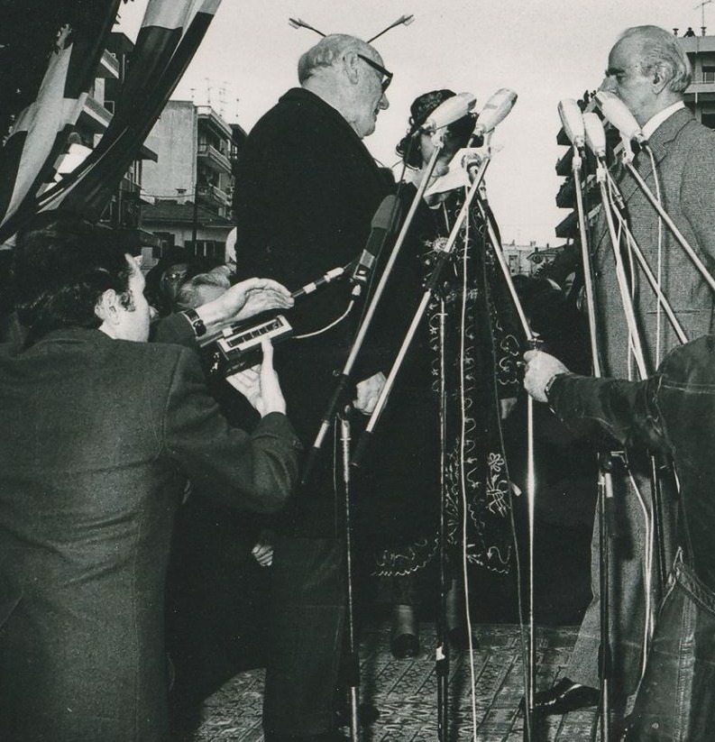 Σαν σήμερα πριν 47 χρόνια. Ο πρωθυπουργός Κων. Καραμανλής φτάνει στα Γιάννινα για τα Ελευθέρια της πόλης, εκφωνεί πολιτικό λόγο για την επικείμενη ένταξή μας στην ΕΟΚ και ο υποφαινόμενος, νεαρός δημοσιογράφος, τον ηχογραφεί με το κασετοφωνάκι. Στιγμιότυπο από φωτογραφία του φωτογράφου Γιάννη Μπράτη.